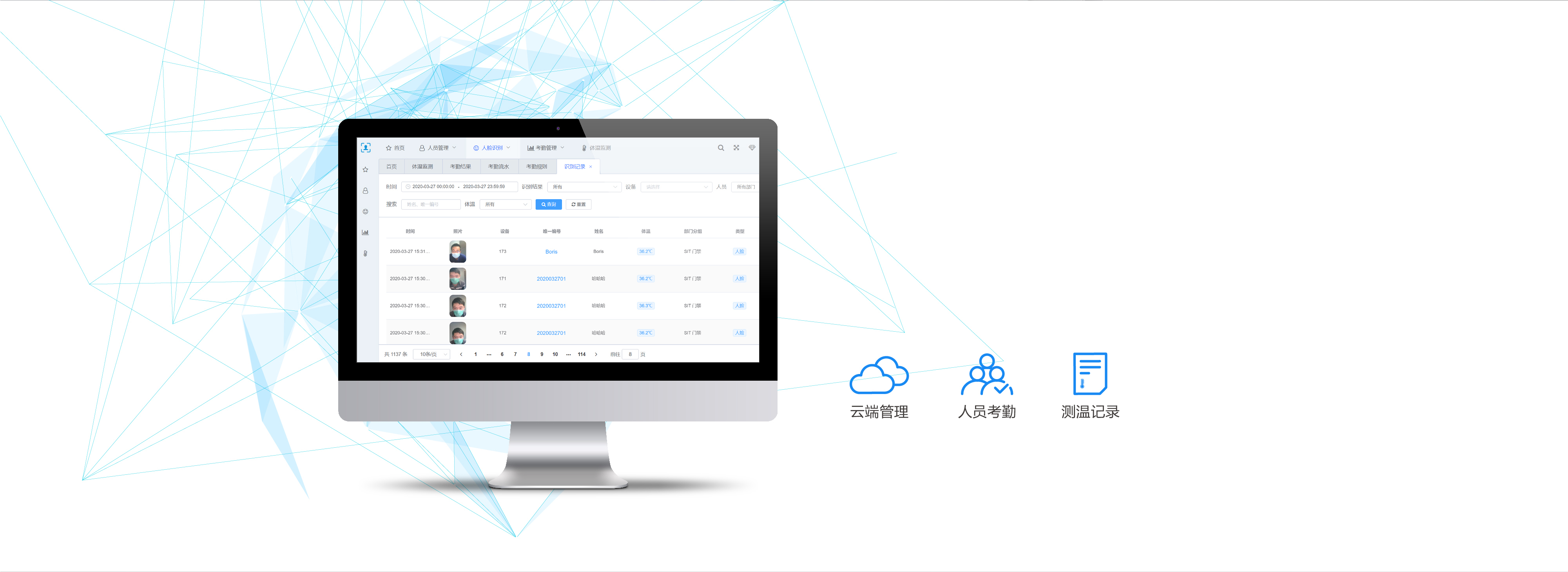 云端管理超温后台预警记录,测温记录,人员考勤及健康管理等