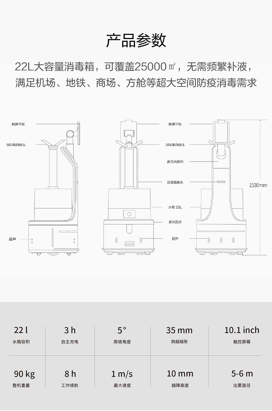 22L大容量消毒箱,可覆盖25000㎡,无需频繁补液,满足机场、地铁、商场、方舱等超大空间防疫消毒需求